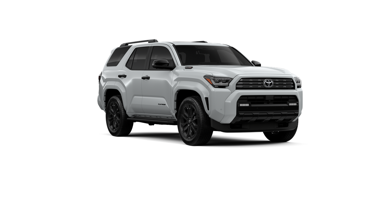 - Exterior@20-in. gloss-black painted alloy wheels~Exterior@Dark-chrome tri-bar grille; gloss-black mirror caps and door handles; color-keyed overfenders and rear spoiler; gloss-black "PLATINUM" and "4RUNNER" badges~Exterior@Black roof rails~Exterior@Premium LED headlights with white Daytime Running Lights (DRL)