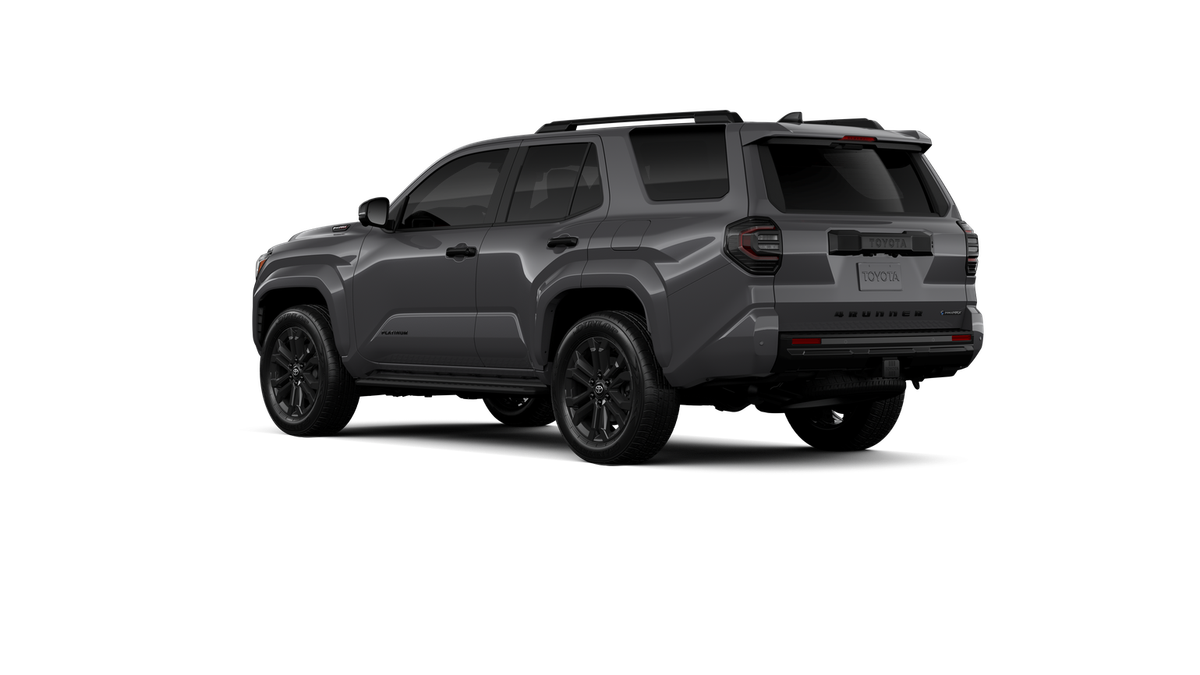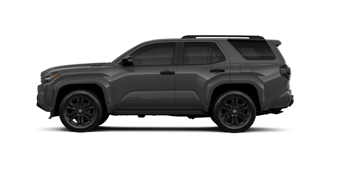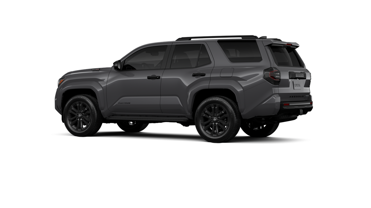 - Exterior@20-in. gloss-black painted alloy wheels~Exterior@Dark-chrome tri-bar grille; gloss-black mirror caps and door handles; color-keyed overfenders and rear spoiler; gloss-black "PLATINUM" and "4RUNNER" badges~Exterior@Black roof rails~Exterior@Premium LED headlights with white Daytime Running Lights (DRL)