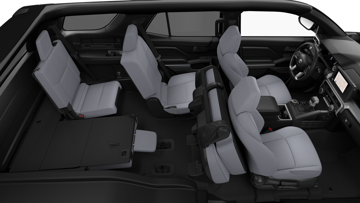 - Normal and Sport Modes~Mechanical and Performance@Drive Modes: TOW/HAUL driving modes 61~Mechanical and Performance@Drivetrain: Part-time 4-Wheel Drive (4WD) with electronically controlled 2-speed transfer case (high/low range) and Active Traction Control (A-TRAC)~Mechanical and Performance@Body/Frame: Reinforced body-on-frame construction with TNGA-F high-strength boxed-steel ladder frame~Mechanical and Performance@Suspension: Independent double-wishbone front suspension with coil springs and stabilizer bar; Multi-link rear suspension with coil springs and stabilizer bar~Mechanical and Performance@Suspension: Conventional twin tube shock absorbers~Mechanical and Performance@Steering: Electric Power Steering (EPS); power-assisted rack-and-pinion~Mechanical and Performance@Brakes: Power-assisted front and rear ventilated disc brakes~Mechanical and Performance@Brakes: Electric Parking Brake (EPB) 6~Mechanical and Performance@Off-Road: Front and rear recovery points~Mechanical and Performance@Towing: Integrated towing receiver hitch and wiring harness with 4- and 7-pin connectors 61~Safety and Convenience@3-point seatbelts for all seating positions; driver's-side Emergency Locking Retractor (ELR) and Automatic/Emergency Locking Retractor (ALR/ELR) on all passenger seatbelts~Safety and Convenience@Toyota Safety Sense™ 3.0 (TSS 3.0) 66 — Pre-Collision System with Pedestrian Detection (PCS w/PD)