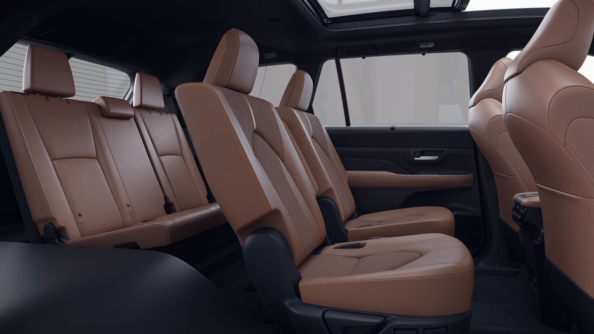 - 7-passenger seating with second-row fold-down captain's chairs and fold-down inboard armrests, adjustable headrests and two cup holders mounted on the floor; and 60/40 split, fold-down third-row seats with sliding headrests and recline function