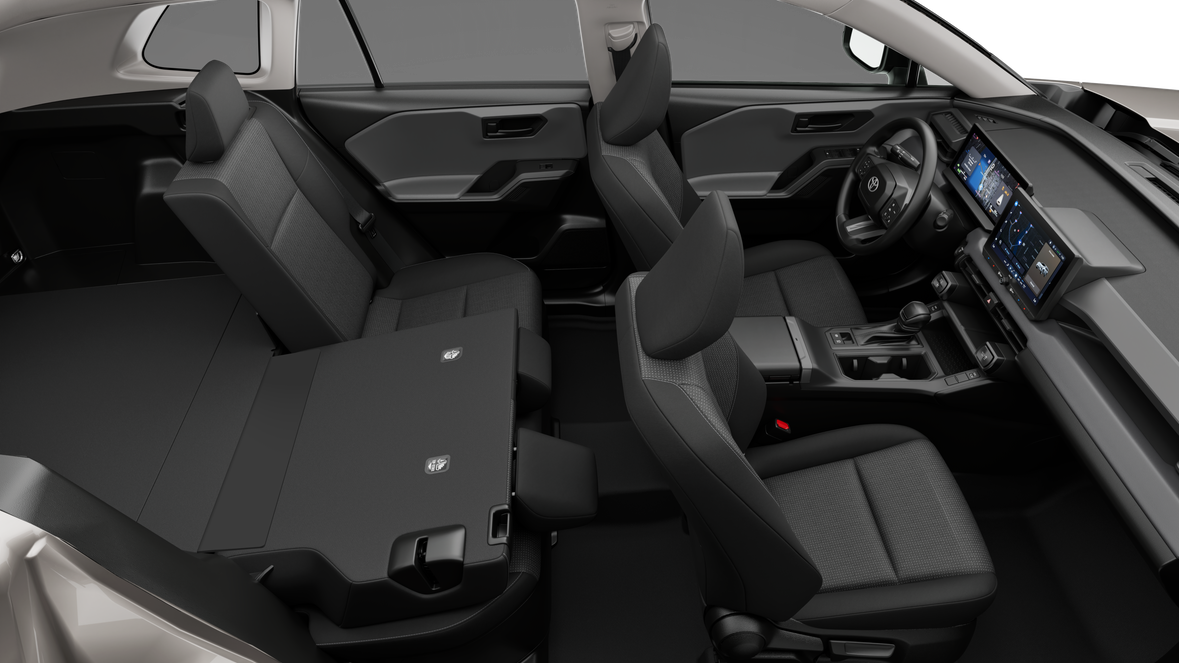 - sunglasses storage and Safety Connect® 55 button~Interior@60/40 split reclining fold-flat rear seat with center armrest and cup holders~Interior@Silver interior door handles~Interior@Cargo area tonneau cover~Interior@Height-adjustable rear cargo area deck board~Interior@Black carpet flooring with driver-side footrest~Interior@Day/night rearview mirror~Interior@Chrome-painted dash with urethane dash panels and soft-touch leather-wrapped armrests~Interior@RAV4-branded center console~Interior@One 12V/120W auxiliary power outlet 2 in front instrument panel storage tray and one 12V/120W auxiliary power outlet 2 in cargo area~Interior@Two 15w front USB-C charging ports 77 and one center console media USB-C charging port 77~Interior@Power windows with auto up/down and jam protection in all positions~Interior@Power door locks with shift-linked automatic lock/unlock feature~Interior@Rear liftgate window defogger~Interior@10.5-in. Toyota Audio Multimedia