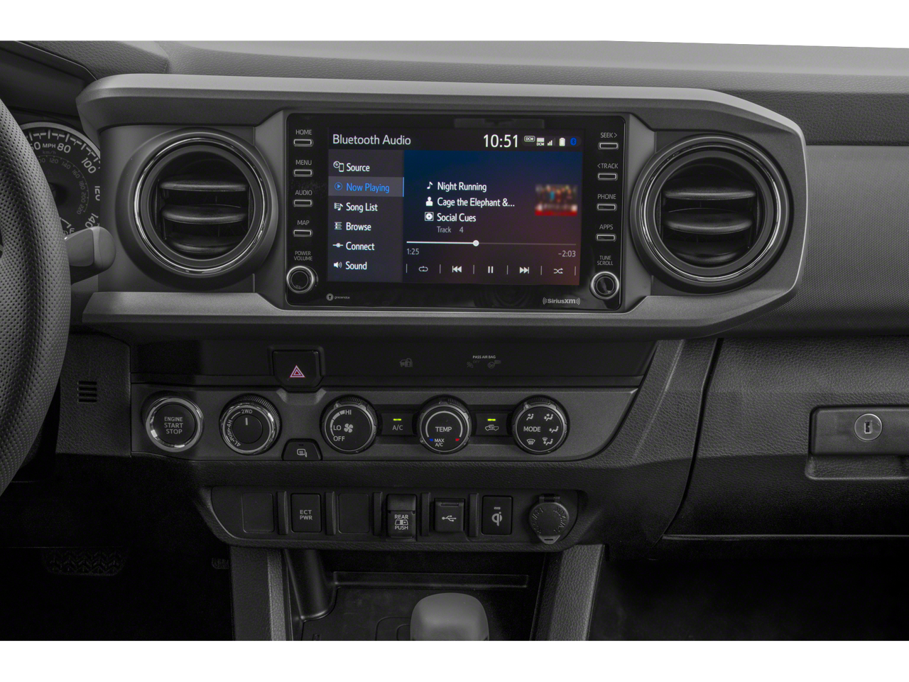 4WD, 120V/400W Deck Mounted AC Power, 6 Speakers, ABS brakes, Air Conditioning, Alloy wheels, AM/FM radio: SiriusXM, Anti-whiplash front head restraints, Apple CarPlay/Android Auto, Auto High-beam Headlights, Auto-dimming Rear-View mirror, Auto-Dimming Rearview Mirror w/HomeLink, Automatic temperature control, Black Overfenders, Blind Spot Monitor w/Rear Cross Traffic Alert, Brake assist, Bumpers: body-color, Driver door bin, Dual front impact airbags, Dual front side impact airbags, Electronic Stability Control, Emergency communication system: Safety Connect (1-year trial), Engine Immobilizer, Exterior Parking Camera Rear, Fabric Seat Trim, Front anti-roll bar, Front Bucket Seats, Front Center Armrest, Front Door Smart Key System w/Push Button Start, Front dual zone A/C, Front fog lights, Front reading lights, Front Seats, Front wheel independent suspension, Garage door transmitter: HomeLink, Heated door mirrors, Illuminated entry, Knee airbag, Leather Seat Trim, Leather Shift Knob, Low tire pressure warning, Mesh Front Grille, Multi Terrain Monitor w/Camera, Occupant sensing airbag, Outside temperature display, Overhead airbag, Overhead console, Panic alarm, Passenger door bin, Power door mirrors, Power driver seat, Power Sliding Rear Window w/Privacy Glass, Power steering, Power windows, Radio: Audio, Radio: Premium Audio w/Dynamic Navigation, Radio: Premium JBL Audio w/Dynamic Navigation, Rear Parking Assist Sonar, Rear step bumper, Remote keyless entry, Security system, Speed control, Speed-sensing steering, Split folding rear seat, Steering wheel mounted audio controls, Tachometer, Technology Package, Telescoping steering wheel, Tilt steering wheel, Traction control, TRD Off Road Package, Trip computer, Turn signal indicator mirrors, Variably intermittent wipers, Wheels: 16 Machined Contrast Alloy.