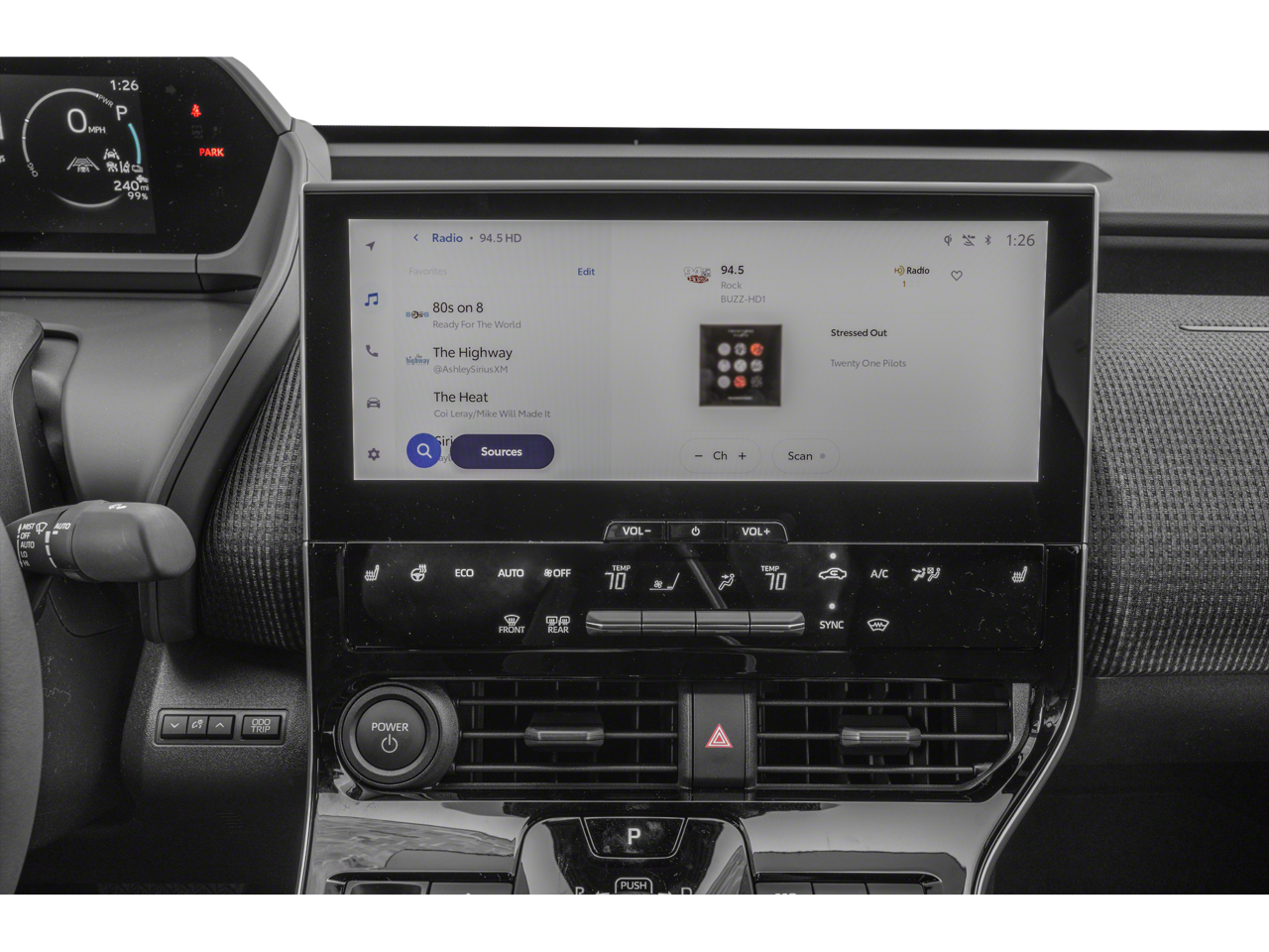 4-Wheel Disc Brakes, 6 Speakers, ABS brakes, Air Conditioning, Alloy wheels, AM/FM radio: SiriusXM, Apple CarPlay/Android Auto, Auto High-beam Headlights, Auto-dimming Rear-View mirror, Automatic temperature control, Brake assist, Bumpers: body-color, Delay-off headlights, Driver door bin, Driver vanity mirror, Dual front impact airbags, Dual front side impact airbags, Electronic Stability Control, Emergency communication system: Safety Connect (10-year trial), Exterior Parking Camera Rear, Fabric & SofTex Seat Trim, Four wheel independent suspension, Front anti-roll bar, Front Bucket Seats, Front Center Armrest, Front dual zone A/C, Front reading lights, Front Seats, Fully automatic headlights, Heated door mirrors, Heated Front Seats, Heated Leather-Trimmed Steering Wheel, Illuminated entry, Knee airbag, Leather steering wheel, Low tire pressure warning, Navigation system: Drive Connect (3 year trial) includes Cloud Navigation with real time traffic and Google POI, Occupant sensing airbag, Outside temperature display, Overhead airbag, Overhead console, Panic alarm, Passenger door bin, Passenger vanity mirror, Power door mirrors, Power driver seat, Power Liftgate, Power steering, Power windows, Radio data system, Radio: 12.3 Toyota Audio Multimedia w/6 Speakers, Rain sensing wipers, Rear anti-roll bar, Rear seat center armrest, Rear window defroster, Remote keyless entry, Security system, Speed control, Speed-sensing steering, Split folding rear seat, Spoiler, Steering wheel mounted audio controls, Telescoping steering wheel, Tilt steering wheel, Traction control, Trip computer, Turn signal indicator mirrors, Variably intermittent wipers, Weather Package, Wheels: 18 Alloy w/Two-Tone Covers.