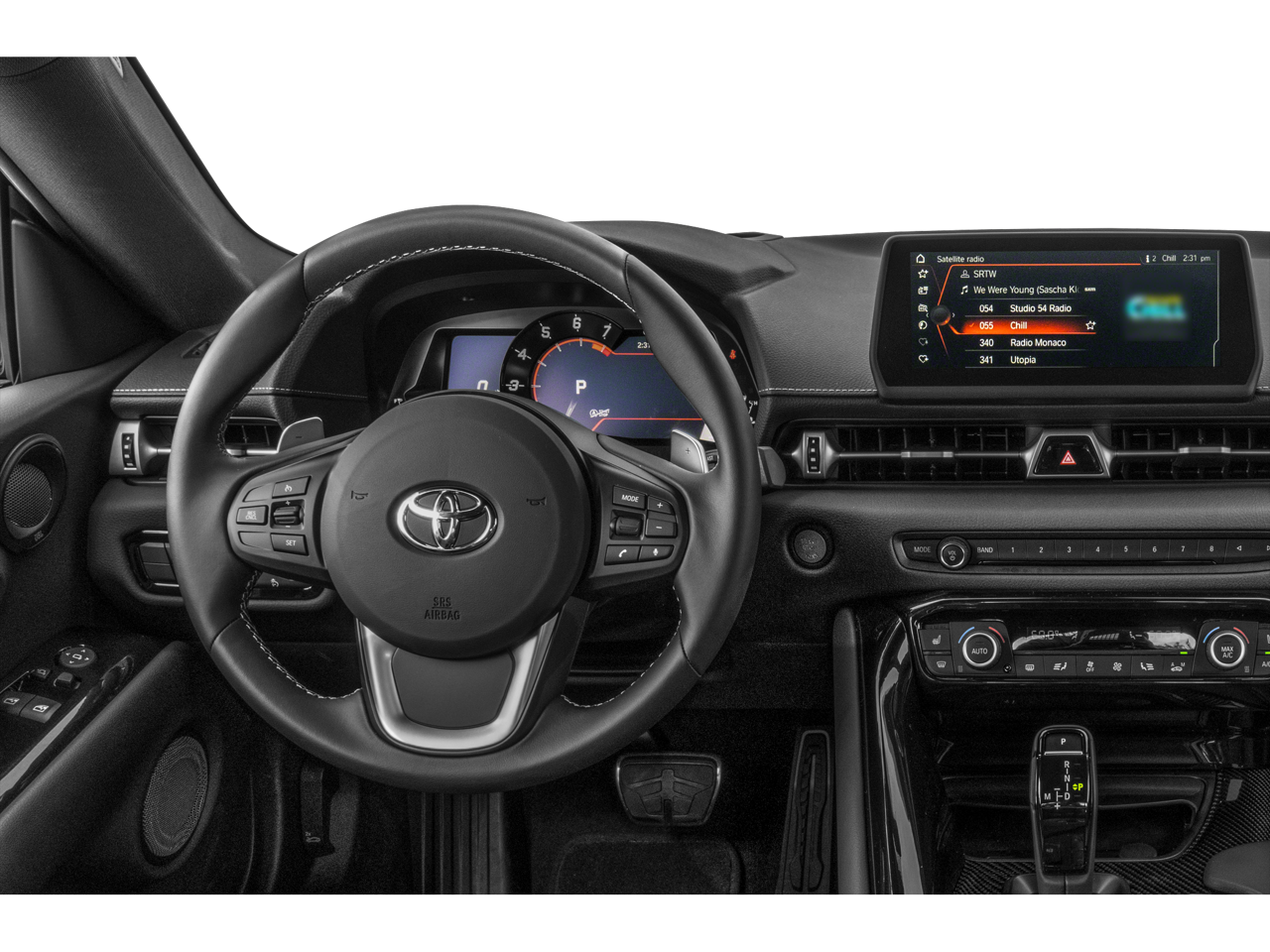 12 Speakers, 4-Wheel Disc Brakes, ABS brakes, Adaptive suspension, Air Conditioning, Alloy wheels, AM/FM radio: SiriusXM, Apple CarPlay, Auto High-beam Headlights, Auto-dimming door mirrors, Auto-dimming Rear-View mirror, Automatic temperature control, Blind Spot Monitor (BSM), Brake assist, Bumpers: body-color, Child-Seat-Sensing Airbag, Delay-off headlights, Driver Assist Package, Driver door bin, Driver vanity mirror, Dual front impact airbags, Dual front side impact airbags, Electronic Stability Control, Emergency communication system: Supra Connect (4-year trial), Exterior Parking Camera Rear, Four wheel independent suspension, Front anti-roll bar, Front Bucket Seats, Front Center Armrest, Front dual zone A/C, Front reading lights, Full Speed Dynamic Radar Cruise Control, Fully automatic headlights, Garage door transmitter: HomeLink, Heads-Up Display, Heated door mirrors, Heated front seats, Heated Front Sport Seats, Illuminated entry, Knee airbag, Leather Seat Trim, Leather Shift Knob, Leather steering wheel, Low tire pressure warning, Memory seat, Navigation System, Occupant sensing airbag, Outside temperature display, Overhead airbag, Panic alarm, Parking Sensors w/Emergency Braking Function, Passenger door bin, Passenger vanity mirror, Power door mirrors, Power driver seat, Power passenger seat, Power steering, Power windows, Premium Package, Radio data system, Radio: Supra Command w/JBL, Rain sensing wipers, Rear anti-roll bar, Rear Cross Traffic Alert (RCTA), Rear window defroster, Remote keyless entry, Security system, Speed control, Speed-sensing steering, Speed-Sensitive Wipers, Steering wheel mounted audio controls, Tachometer, Telescoping steering wheel, Tilt steering wheel, Traction control, Trip computer, Turn signal indicator mirrors, Variably intermittent wipers, Wheels: 19 Frozen Gunmetal Gray Forged-Aluminum.